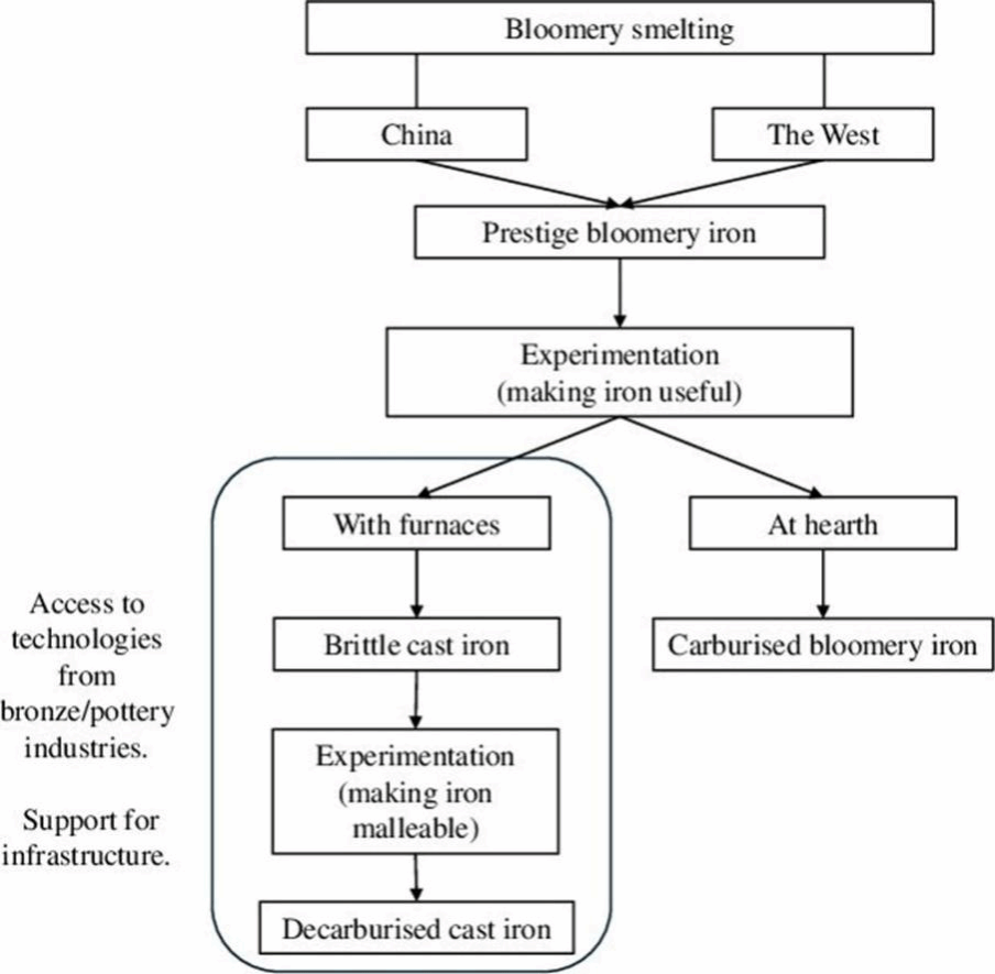 研究发现,中国的铸铁技术起源于块炼铁炉的改进,并高度依赖当时已非常成熟的青铜铸造与制陶技术。青铜工业带来的坩埚熔炼技术(cupola furnace)与陶器烧制中发展出的高温窑炉,为熔铸生铁和脱碳处理提供了必要条件。而与此同时,中国社会正处于春秋战国时期,国家对农业扩张的需求大幅增加,铸铁工具——特别是农具——成为推动土地开垦与边境控制的战略资源。