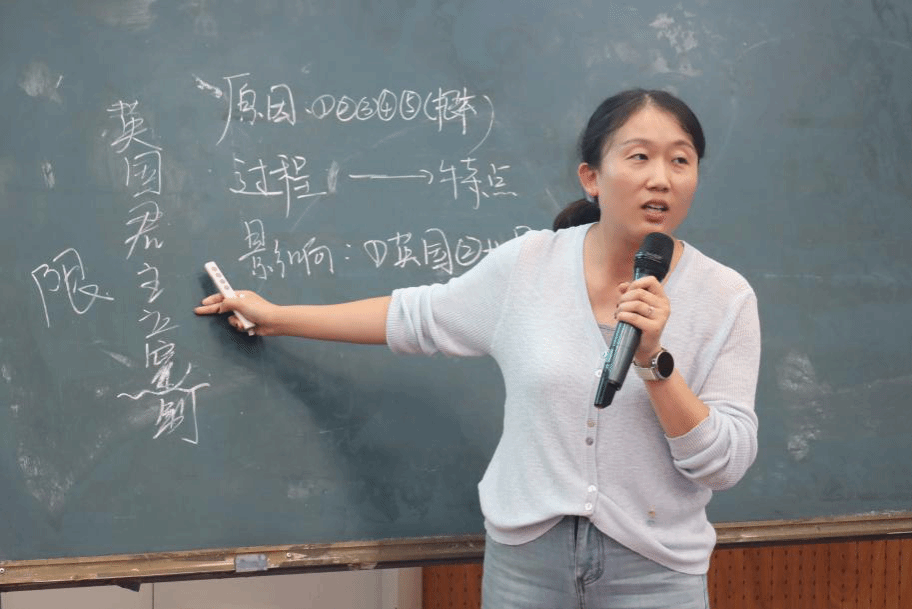 随着《附中欢迎您》的优美音乐声,“同课异构”教研活动拉开帷幕。本次活动以部编版初中历史九年级下册《君主立宪制的英国》为课题,由河大附中教师陆晶与国培学员代表张聪分别授课,展现了不同的教学设计与课堂风采。陆晶的教学设计新颖独到,以“传统与创新的智慧”为核心主线,打破常规叙事框架。课堂以1649年查理一世被处决与2023年查尔斯三世加冕的历史对比切入,激发学生思考英国政治发展的独特路径。她通过精心设计的问题链,引导学生从《大宪章》和议会传统中探寻革命的历史根源,理解英国革命“捍卫传统”的底色;通过剖析斯图亚特王朝专制,揭示“传统失序”的必然性;进而梳理从内战到“光荣革命”的历程,深入解读《权利法案》所体现的平衡智慧。课堂尾声,学生通过对“《权利法案》300周年纪念币”的解读,将主题升华,展现出良好的史料实证能力和历史思维。整堂课逻辑严密、层层递进,学生参与积极。在老师引导下,学生不仅掌握了知识,更学会了以辩证视角审视历史,理解制度创新源于传统根基的智慧。